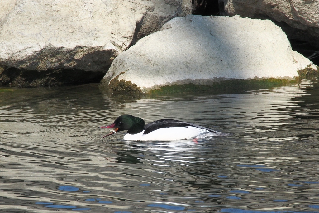 Anatidae, Mergus merganser, Gaensesaeger, Maennchen