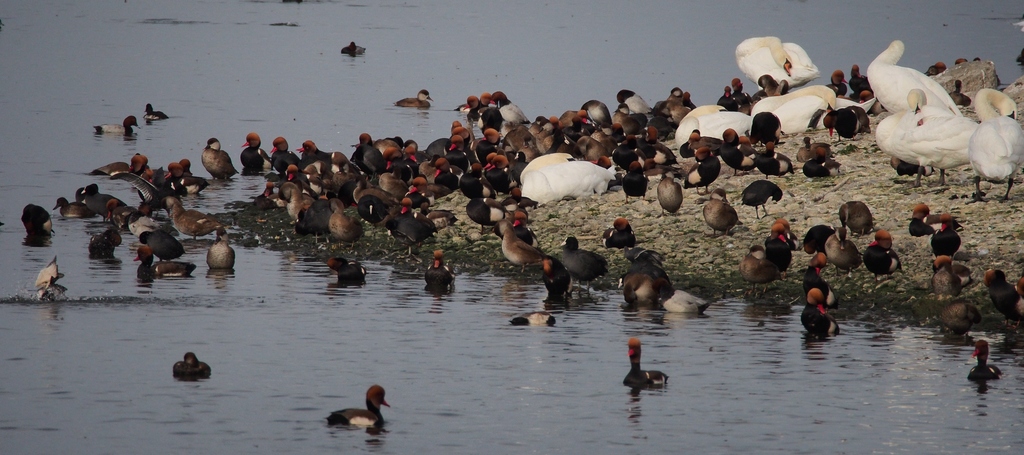 Hoeckerschwaene und Kolbenenten am Bodensee