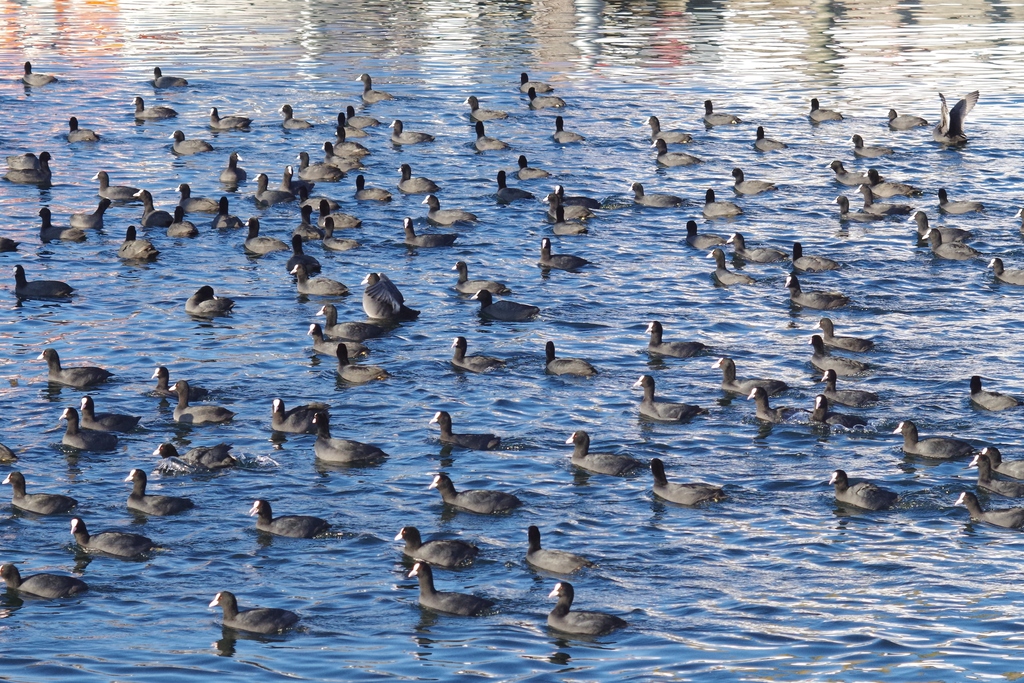 Rallidae, Fulica atra, Blaesshuehner im Schwarm am Bodensee