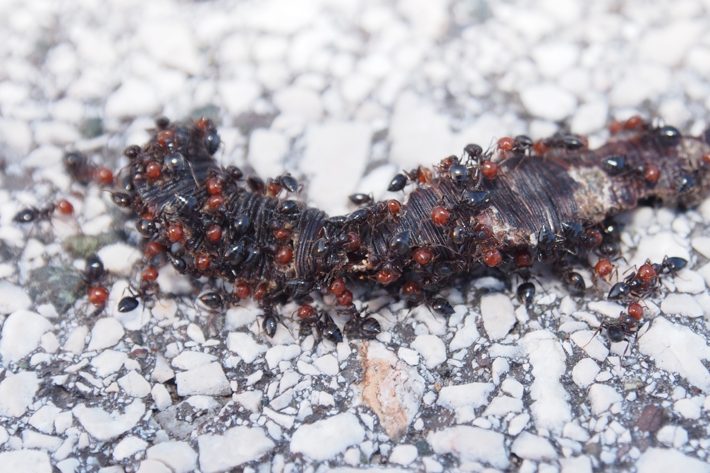 Hymenoptera, Formicidae, Ameisen zerlegen vertrockneten Regenwurm
