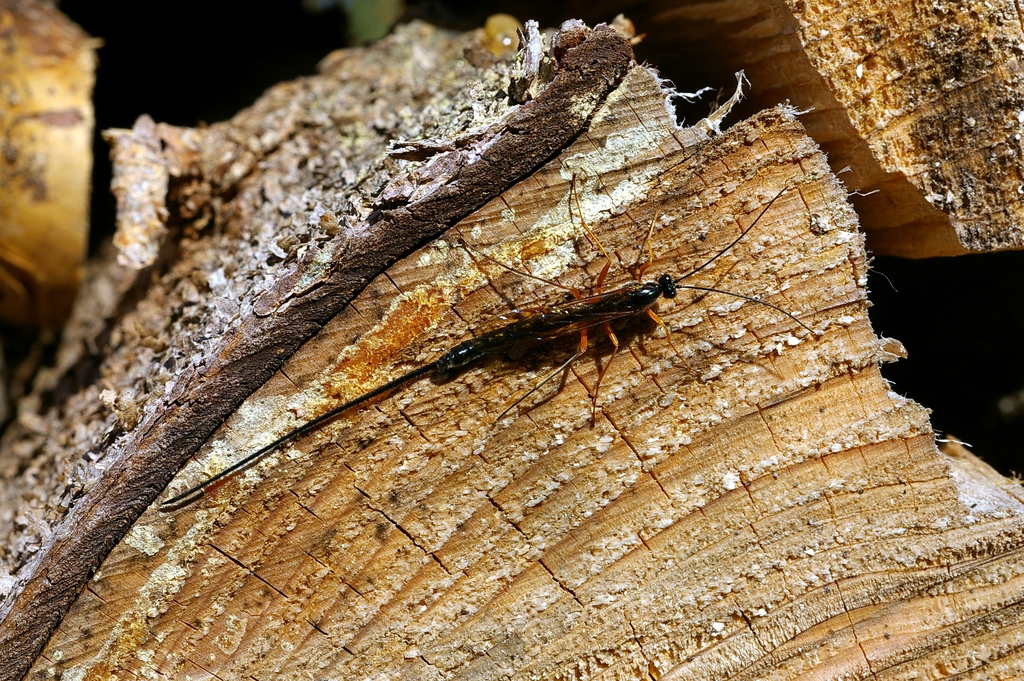 Hymenoptera, Ichneumonidae, an Holzstamm, Eier legend